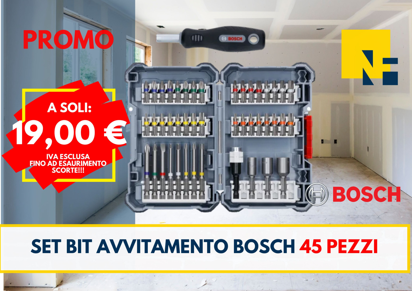 Per tutto il mese di Novembre troverete alla Nuova Fimar una promozione davvero conveniente: il set bit di avvitamento BOSCH con 45 pezzi ad un prezzo stracciato! Questo kit di inserti per avvitamento è una buona scelta per l'uso universale e viene fornito con una custodia modulare comoda e facile da trasportare. Gli elementi sono composti di acciaio modificato S2, che unito al processo di trattamento termico ottimizzato garantisce una resistenza extra e grandi prestazioni in tutte le operazioni. La zona di torsione conica gestisce facilmente i picchi di coppia assorbendo forza e vibrazioni durante l'avvitamento in tutti i materiali. Infine il codice colore offre una veloce panoramica e permette di identificare facilmente il giusto tipo di punta.