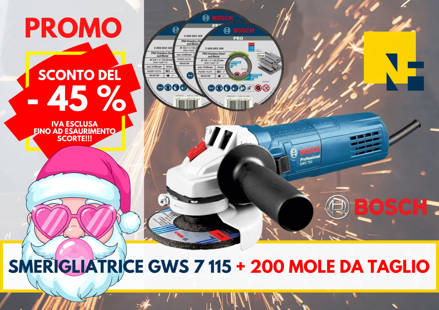 Per questo Natale vogliamo farvi un vero regalo! Solo e soltanto fino ad esaurimento scorte potrete acquistare l'iconica smerigliatrice angolare professionale BOSCH GWS 7 115 con un set di 200 mole da taglio per inox e metallo con uno sconto del 45%! Chi è del mestiere sa che la BOSCH GWS 750 PRO è una smerigliatrice compatta e potente, ideale per lavori di taglio, levigatura e smerigliatura su metalli, inox, legno e ceramica. Dotata di motore da 750 W ad alte prestazioni, garantisce velocità fino a 11.000 giri/min e un avanzamento del lavoro rapido e preciso. Se munita di dischi professionali ad alte prestazioni come i BOSCH PRO INOX & METAL, con grana di corindone resistente per tagli precisi e lunga durata, il risultato garantisce efficienza, rapidità e affidabilità in ogni applicazione.